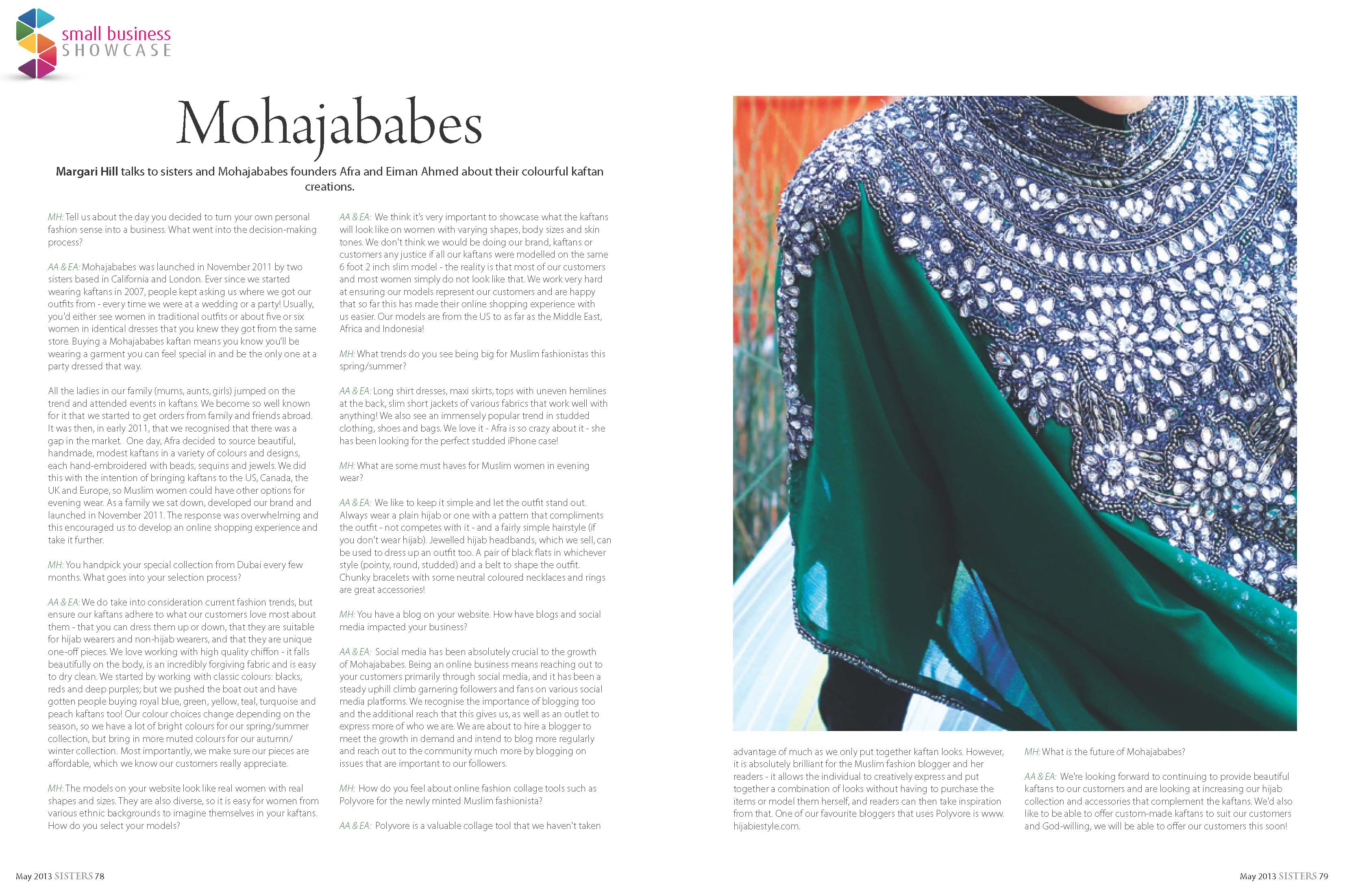 AA & EA: Social media has been absolutely crucial to the growth of Mohajababes. Being an online business means reaching out to your customers primarily through social media, and it has been a steady uphill climb garnering followers and fans on various social media platforms. We recognise the importance of blogging too and the additional reach that this gives us, as well as an outlet to express more of who we are. We are about to hire a blogger to meet the growth in demand and intend to blog more regularly and reach out to the community much more by blogging on issues that are important to our followers.