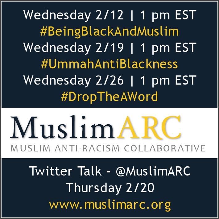 Like Hind Makki, I’m so honored to work with Muslims of different ethnic and racial backgrounds, denominations, and orientations of faith came to address racism. This Black History Month, we hope to deepen our conversation with three more hashtags. In addition, on Feb. 20 Twitter Talk with African American Muslim leaders, Dawud Walid, Amin Nathari, Amina Wadud, and Donna Auston.