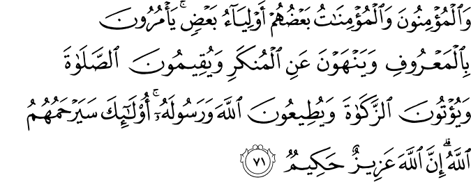 The believing men and women, are protectors and helpers of each other. They (collaborate) to promote all that is good and oppose all that is evil; establish prayers and give charity, and obey Allah and his Messenger. Those are the people whom Allah would grant mercy. Indeed Allah is Exalted and Wise. (Surah Al-Tawbah 9:71)